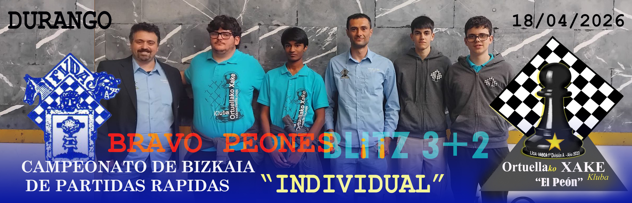 Ayer sábado día 18/04/2025, organizado por la Federación BIZKAIA de ajedrez (FVDA) se disputó en Durango en el Frontón San Fausto de Durango (Evaristo Bustinza Kirikiño, 11) el campeonato de Bizkaia INDIVIDUAL de partidas rápidas Blitz, a un ritmo trepidante y emocionante de 3+2. A las 16:00 horas empezó la acción¡¡