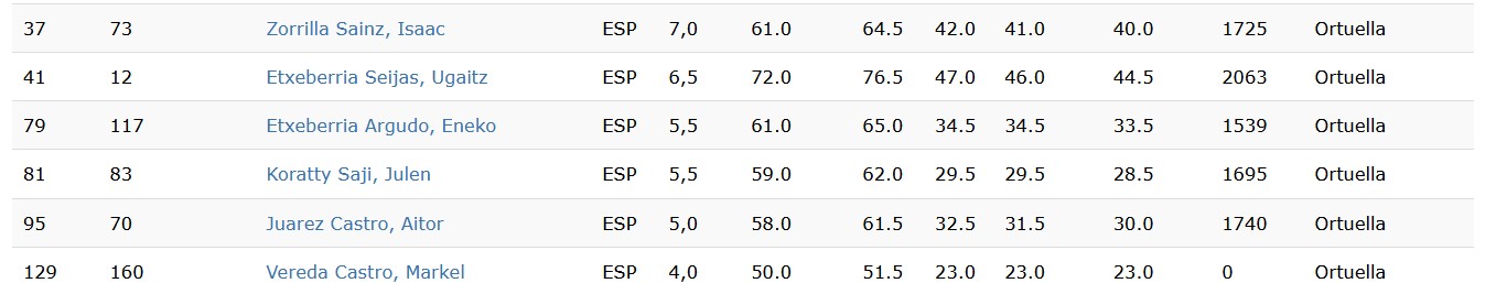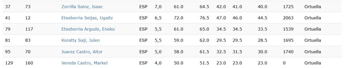 Por otro lado, el mejor de nuestros peones fue Isaac Zorrilla que obtuvo 7 importantes puntos de 11 posibles; le siguió Ugaitz Etxeberria con 6,5 puntos, Eneko Etxeberria 5,5, al igual Julen Koratty, Aitor Juarez 5 y Markel Vereda 4 puntos, en definitiva, buenos resultados (sobre todo el de Isaac) dado el nivel de participación en el que mas de 20 jugadores pasaban de 2000 puntos ELO. ¡¡¡ Bravo peones¡¡¡