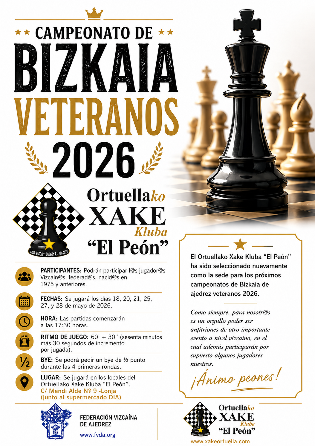 El Ortuellako Xake Kluba «El Peón» ha sido seleccionado nuevamente como la sede para los próximos campeonatos de Bizkaia de ajedrez veteranos 2026.