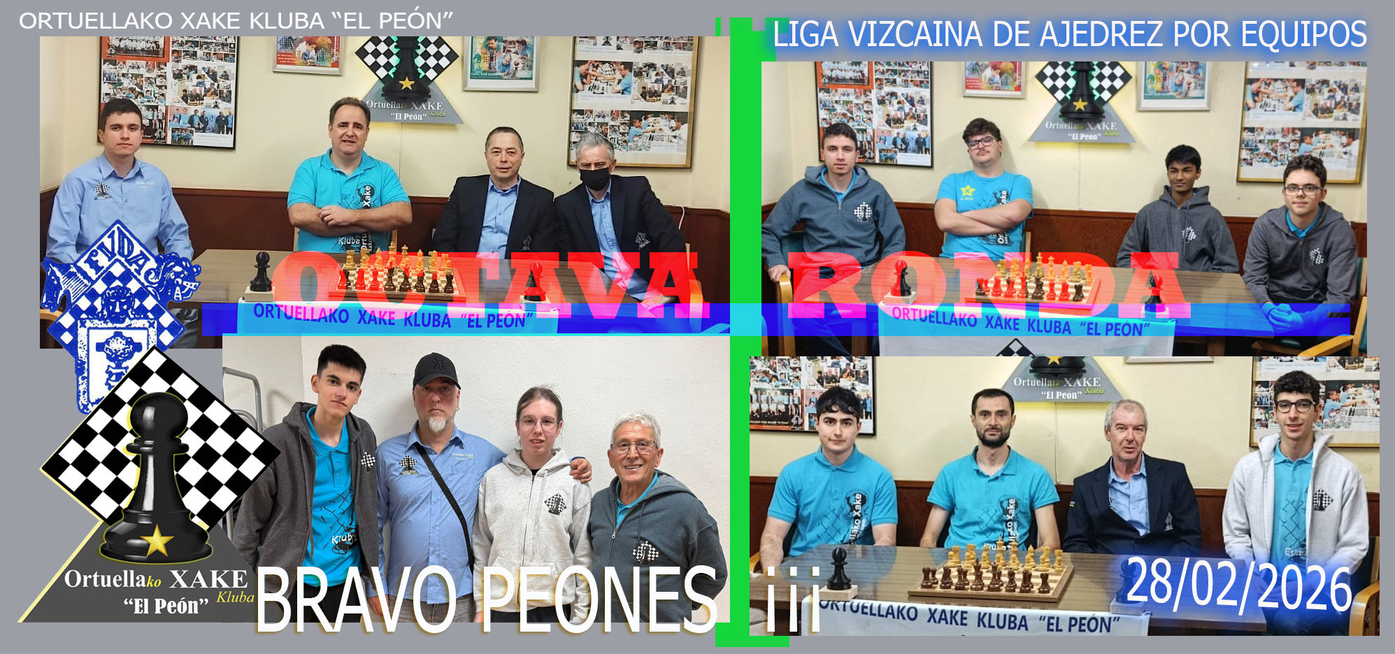 Hoy sábado 28 de febrero, el Ortuellako Xake Kluba «El Peón» disputo una octava (jornada clave en la Liga Vizcaína) en la que tres de nuestros equipos el A , el B y el C jugaban en casa, únicamente nuestro equipo D se desplazaba hasta Sestao para intentar escalar puestos en la tabla.