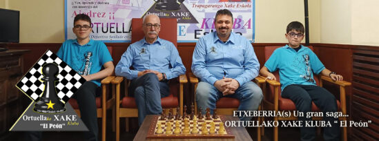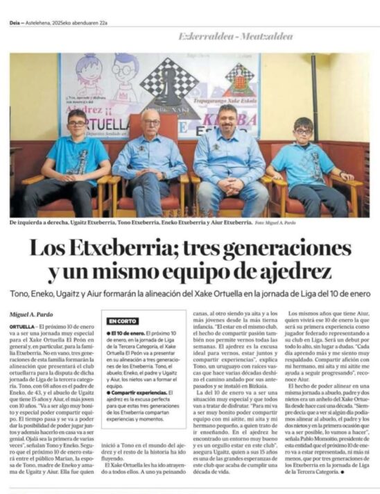 El próximo 10 de enero va a ser una jornada muy especial para el Xake Ortuella El Peón en general y, en particular, para la familia Etxeberria. No en vano, tres generaciones de esta familia formarán la alineación que presentará el club ortuellarra para la disputa de dicha jornada de Liga de la tercera categoría. Tono, con 68 años es el padre de Eneko, de 43, y el abuelo de Ugaitz que tiene 15 años y Aiur, el más joven con 10 años. “Va a ser algo muy bonito y especial poder compartir equipo. El tiempo pasa y se va a poder dar la posibilidad de poder jugar juntos y además hacerlo en casa va a ser genial. Ojalá sea la primera de varias veces”, señalan Tono y Eneko. Seguro que el próximo 10 de enero estará entre el público Marian, la esposa de Tono, madre de Eneko y amama de Ugaitz y Aiur. Ella fue quien inició a Tono en el mundo del ajedrez y el resto de la historia ha ido fluyendo.