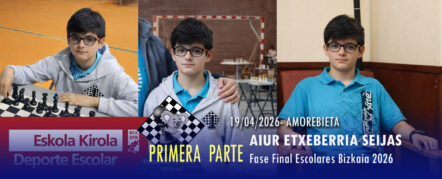 Hoy Domingo 19/04/2026 se ha disputado en Amorebieta la primera fase de la final de los escolares de Bizkaia de ajedrez (de la categoría Alevín) organizados por la DFB (Diputación foral de Bizkaia) y por la Federación Vizcaína de ajedrez (FVDA).