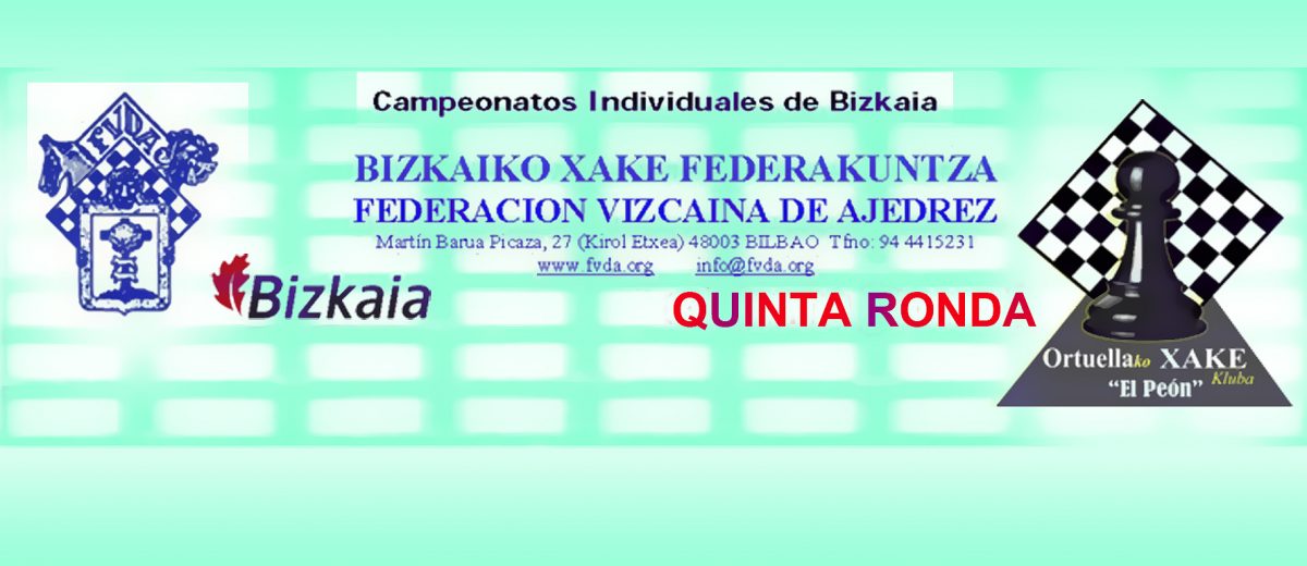 Hoy hemos disputado la quinta ronda de los individuales y la cosa se empieza a poner emocionante a falta de dos rondas. Las opciones están aún abiertas para todos los peones aunque parece que José Félix y Ángel (que ha perdido hoy en el derbi contra Unai) se han descolgado ya del posible ascenso a primera, sin embargo Endika está muy muy cerca después de derrotar hoy al veterano Max Cuero; y Pablo, Josu y Unai también lo tienen probable tras sus respectivas victorias de hoy, y si en las dos partidas que quedan sacan un punto y medio al menos. Todo por decidir en los ascensos a SEGUNDA.