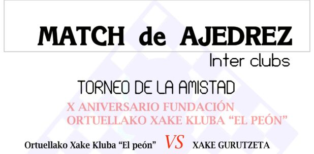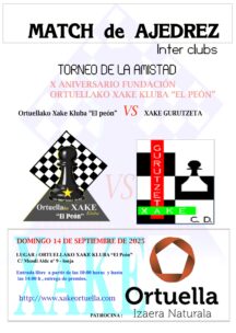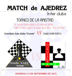 Al día siguiente del Social (el domingo 14/09/2025), con motivo de nuestro X Aniversario disputaremos «un torneo de la amistad» MATCH inter-clubles de ajedrez Clásico (si es posible 15 para 15 jugador@s) contra nuestr@s amig@s y rivales «Xake Gurutzeta.