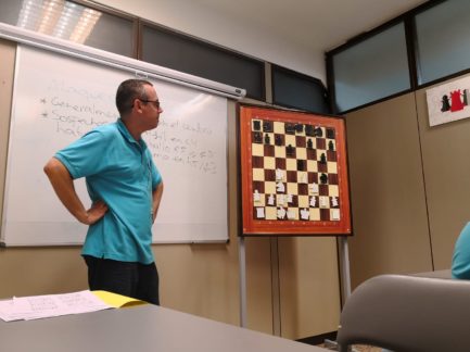 En esta última sesión se ha explicado el proceso para ganar finales de alfiles del mismo color habiendo dos flancos y ventaja de un peón. También ha expuesto posiciones donde el rey tiene un papel atacante en el medio juego (por ejemplo, la inmortal de Short). Seguidamente presentó posiciones sorprendentes del libro de Yochanan Afek y Emmanuel Neiman «Las jugadas invisibles en ajedrez», para finalizar el cursillo disfrutando de los múltiples sacrificios de la partida Fleissig- Schlechter (1895)