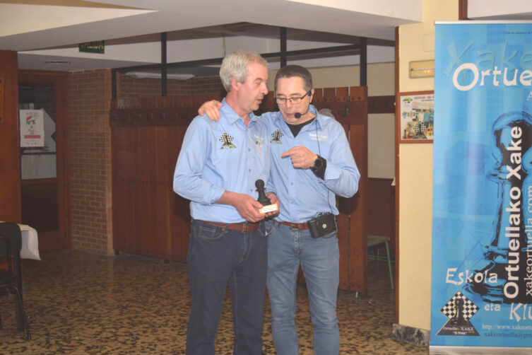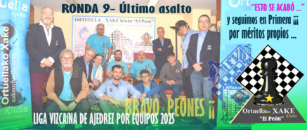 Un descenso ya firmado con antelación; el de nuestro equipo “C” de segunda (Grupo “B” que jugaba en casa) pero que ha servido para que dos de sus integrantes se lleven un bonito peón (cortesía de la casa); Toño al mejor capitán e Isaac al jugador más comprometido, lo tienen más que merecidos… Al final hoy Toño a perder, Isaac a perder, Goti a perder y solo el chaval nuestro tercer tablero Aitor Juarez ha salvado el honor haciendo tablas. Equipo farolillo y rojo y descenso de categoría; mucho animo peones el año que viene estaréis otra vez peleando por el ascenso. Resultado Ortuella “C” 0,5 – Torres Quevedo 3,5 .