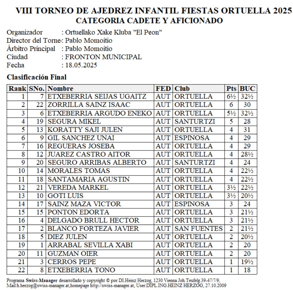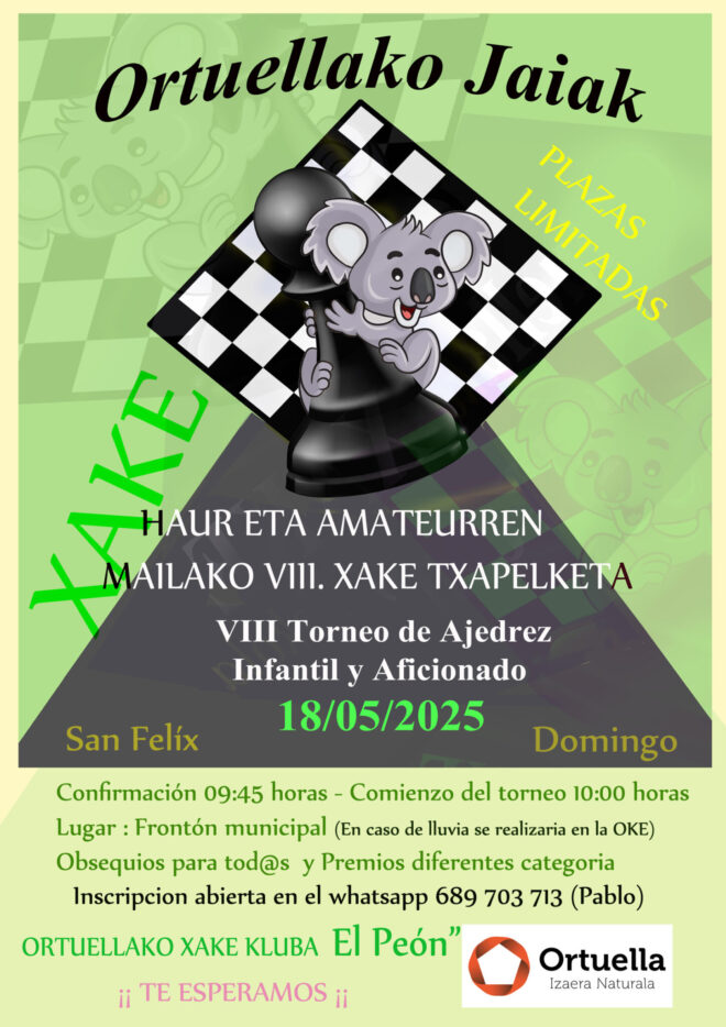 Como actividad deportiva y lúdica incluida en el programa de fiestas hemos celebrado hoy domingo 18/05/2025 ( San Félix ¡¡¡) la VIII Edición de un torneo de ajedrez que el Ayto. de Ortuella impulsa desde hace varios años en pro de este deporte y de los beneficios que otorga y propone a quienes lo practicamos y sobre todo a l@s más pequeñ@s.