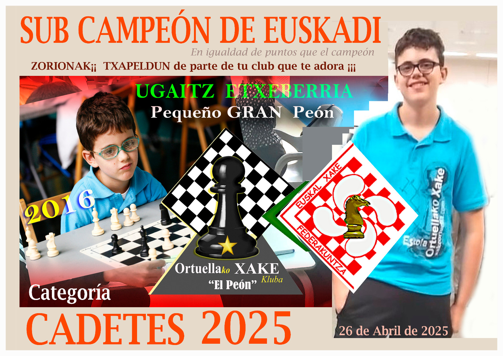 Ugaitz Etxeberria, a quien además el club homenajeo y dio una bonita sorpresa de reconocimiento por quedar subcampeón de Euskadi Cadetes, y por representar por ello al club en el próximo campeonato de España individual (Cadetes). Mencionar también que Ugaitz esta también escogido por la selección de Euskadi de “Equipos Cadetes” y que también participara en el campeonato de España de dicha modalidad.