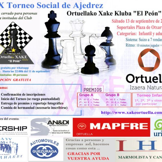 Desde este momento queda abierta la inscripción para nuestro X Torneo Social de ajedrez ORTUELLAKO XAKE KLUBA “El Peón” que se celebrara en la Plaza de Otxartaga en nuestro pueblo el sábado 13/09/2025.