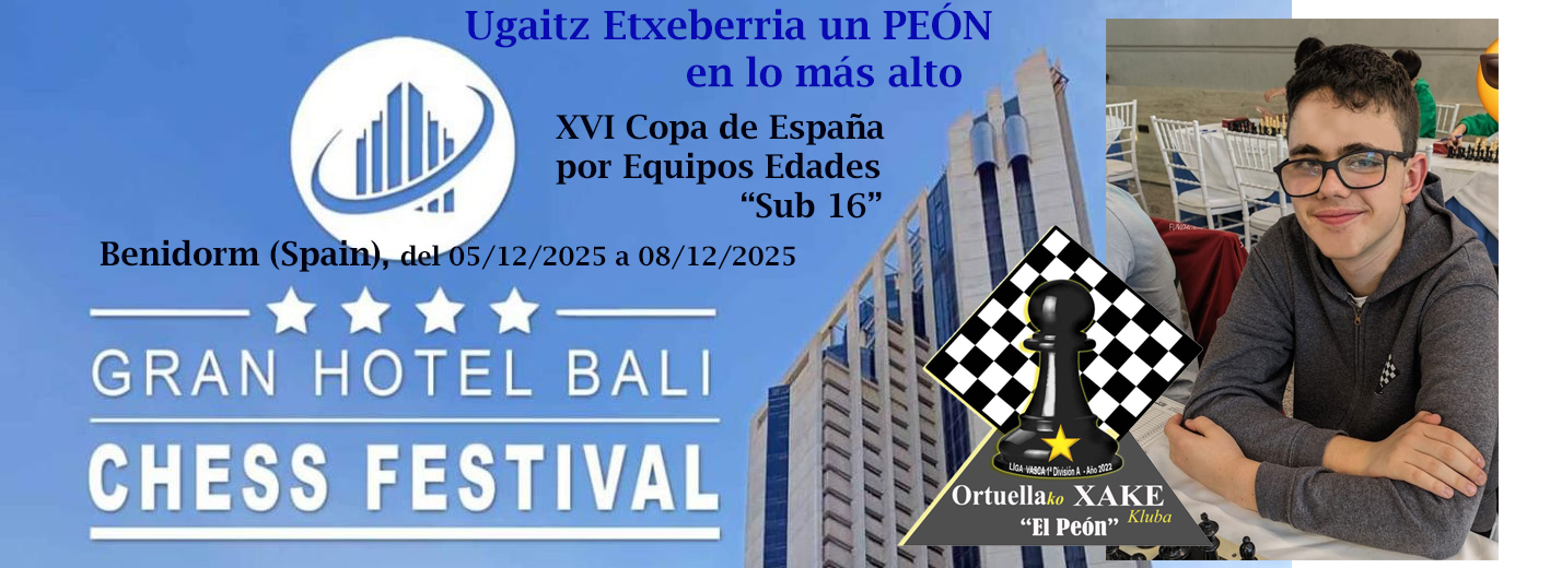 Este verano Pasado Ugaitz ya fue seleccionado por la Federación Vasca para representar a Euskadi en el campeonato de España CADETE de comunidades autonómicas, y ahora un club vasco (Álava) MARTINTXO, le ha elegido para ser el primer tablero en la XVI Copa de España por Equipos Edades Sub 16 en representación (temporal y puntual) de este importante club vasco.