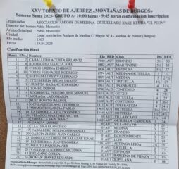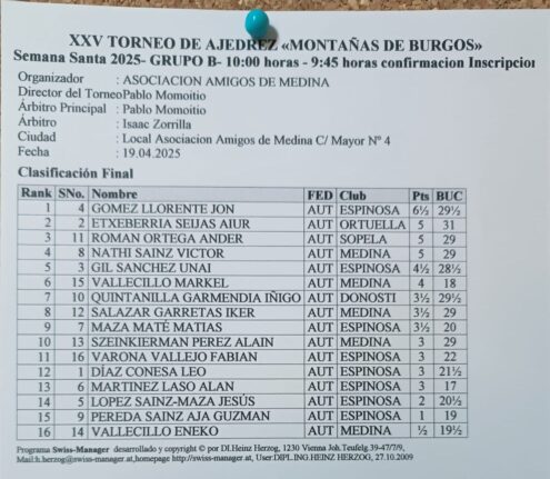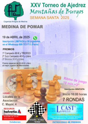 Hoy sábado día 19/04/2025 disputamos una nueva edición de este emblemático ya torneo de ajedrez de Medina de Pomar. Este empezó siendo un torneo de Amigos, de Amigos de la Asociación Amigos de Medina (valga la doble redundancia) y se está convirtiendo, – ya lo es -, en algo más grande en todos los sentidos …